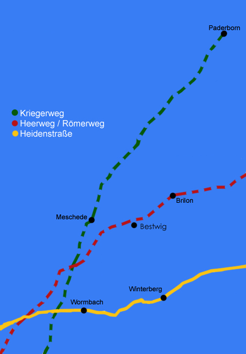 Eine weitere Handelsstraße durch das Sauerland mit Spuren von Jakobuspilgern ist der Heerweg, der im westlichen Teil auch "Römerweg" genannt wird. Der Heerweg/Römerweg führte zur damaligen Zeit von Bonn, wo die Römer ein stark befestigtes Militärlager gegründet hatten, in nordöstlicher Richtung durch das Bergische Land und das südliche Sauerland nach Obermarsberg. Dort ließen die Sachsen einst die ehemalige Grenzfeste Eresburg errichten, die später von Karl dem Großen auf einem Heerzug erobert wurde. Münzfunde bei Marsberg und Brilon aus den Zeiten Hadrians und Licinus belegen die historische Bedeutung dieser alten Handelsstraße. Viele Reisende aus der damaligen Zeit nutzten den kürzeren, aber auch beschwerlicheren Weg über die Sauerländer Höhen, um auf diese Weise schneller zu den nächsten Pilgerzentren im Rheinland zu gelangen.