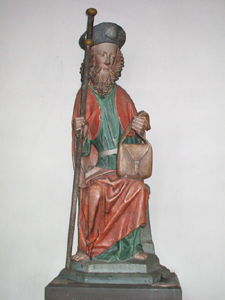 Sankt Jakobus (spanisch: Santiago) war einer der zwölf Apostel Jesu. Um die Person von Jakobus dem Älteren ranken sich zahlreiche Geschichten und Legenden. Der Überlieferung nach lebte Jakobus nach der Kreuzigung Jesu als Missionar in Spanien, bis er nach seiner Rückkehr um 44 n. Chr. in Jerusalem enthauptet wurde. Sein Leichnam - so berichtet die Legende - gelangte um 614 ins nordwestliche Spanien, wo seine Grabstätte zunächst in Vergessenheit geriet. Anfang des 9. Jahrhunderts wurde der Legende nach die Grabstätte des Apostels durch einen Bischof wieder entdeckt. Dieser erkannte in den gefundenen Gebeinen jene des Apostels und ließ sie in die später nach Jakobus benannte nordspanische Stadt Santiago de Compostela bringen, wo sie bis heute in der Krypta der Kathedrale aufgebahrt liegen. Das Bild zeigt eine Jakobusdarstellung in der Jakobuskirche Remblinghausen.